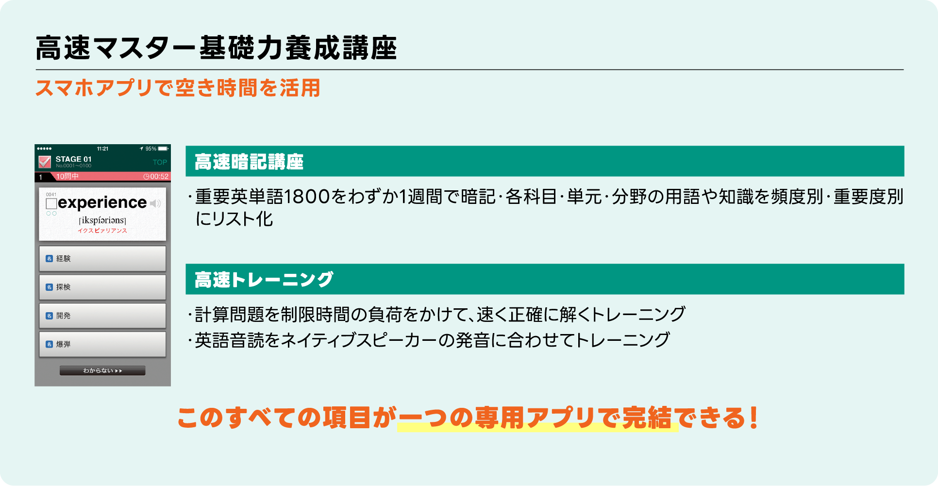 難関大合格者がオススメする東進の人気コンテンツ「高速マスター基礎力養成講座」をプチ体験。共通テストを99%以上カバーしている英単語などを一気に覚えられる講座を、実際に受けてみよう。